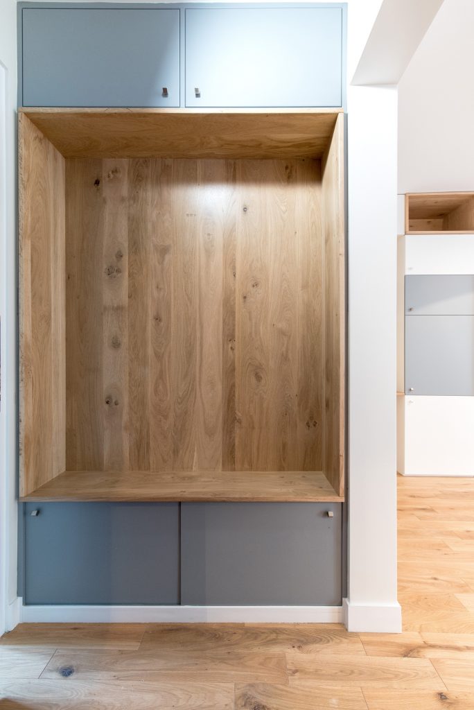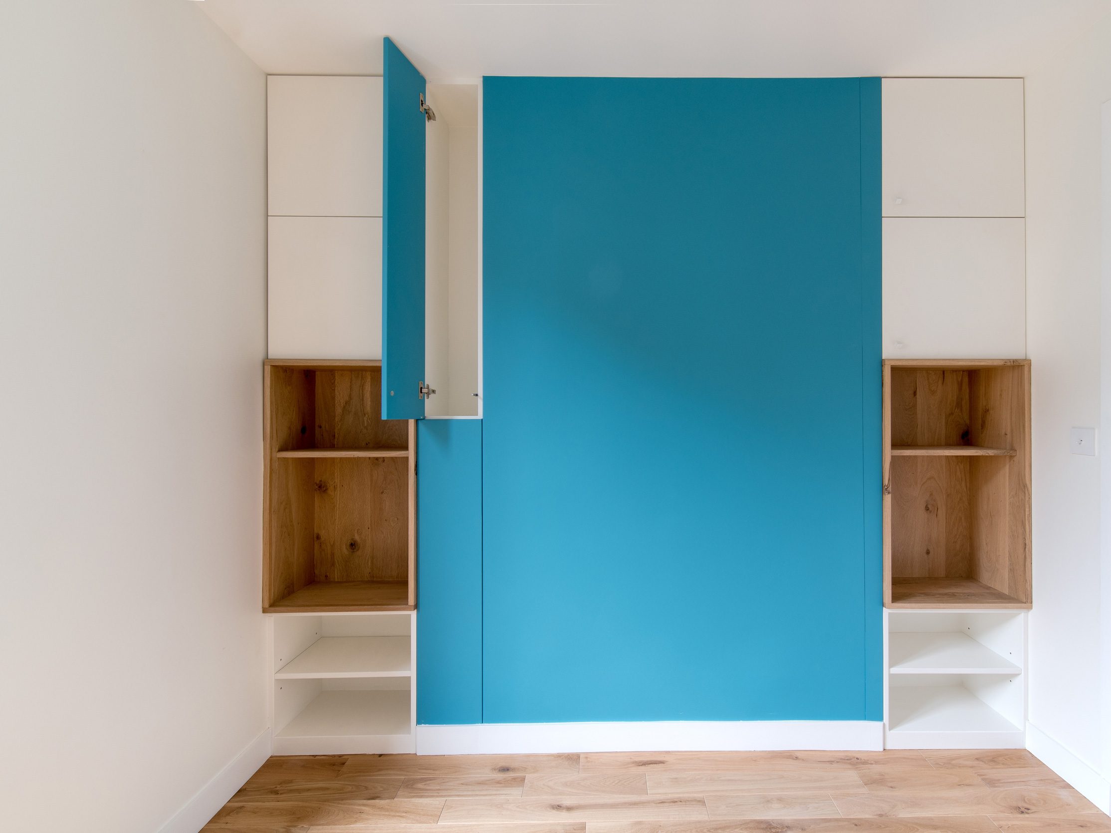 Un faux plancher, atteignant jusqu’à 20 cm par endroits, a été créé pour niveler le sol. Il accueille une partie des réseaux électriques et de plomberie, tout en améliorant l’isolation acoustique et thermique de l’appartement. Des placards sur mesure ont été intégrés dans l’épaisseur des parois afin d’optimiser les rangements et d’épurer les lignes.