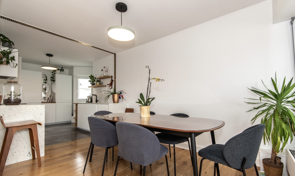 Ce projet explore la versatilité et la capacité d’un lieu à se transformer sans perdre son identité. L’ouverture de la cuisine sur la salle à manger, elle-même en lien direct avec le salon, a permis de créer une continuité fluide entre les espaces, d’amener la lumière naturelle et de favoriser la ventilation traversante.