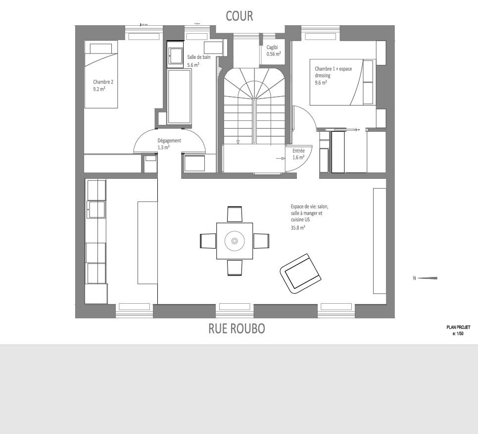 La distribution d’origine, cloisonnée et peu rationnelle, a été entièrement revue. L’ancienne entrée a été déplacée afin d’optimiser chaque centimètre carré et de dégager une vaste pièce de vie de près de 36 m². Les anciennes cheminées, inutilisées, ont été supprimées, permettant de libérer de l’espace et d’ouvrir les volumes tout en préservant la ventilation croisée et la lumière naturelle qui traversent le logement.