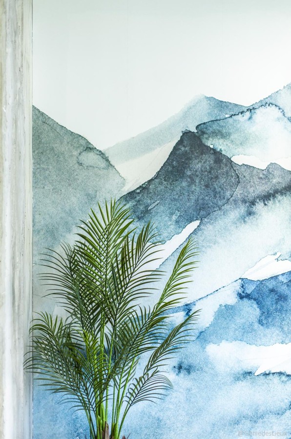 Dans le salon, une fresque réalisée sur place vient unifier l’ensemble, établissant un lien chromatique et formel entre les trois espaces.