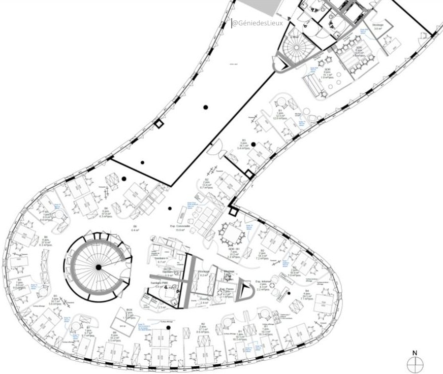 La forme courbe du bâtiment a représenté un véritable défi pour l’aménagement : elle a nécessité une réflexion précise sur les circulations, les perspectives et la répartition des espaces. Le résultat propose une grande variété d’usages — bureaux ouverts et fermés, salles de réunion, zones collaboratives et de convivialité — dans une organisation fluide et cohérente.